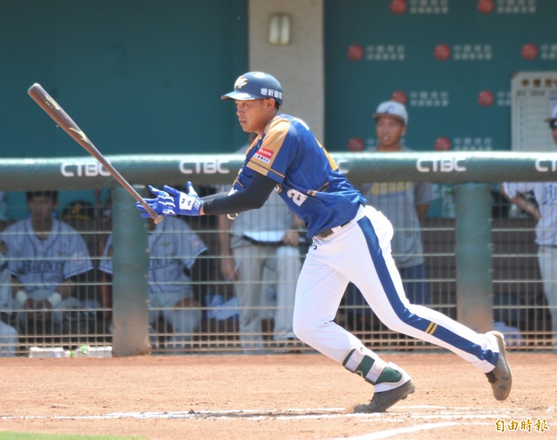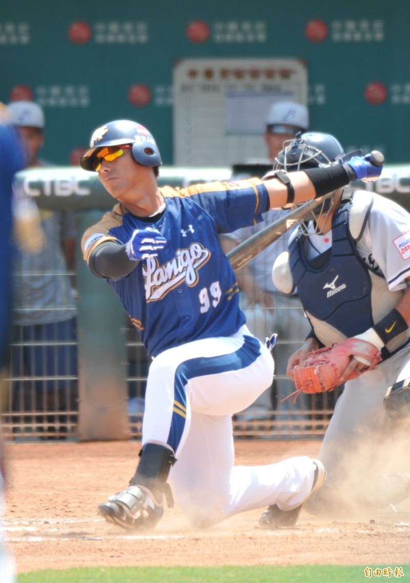 Lamigo二軍董子浩在6局上擊出1分打點一壘安打,攻下第3分。(記者黃志源攝)