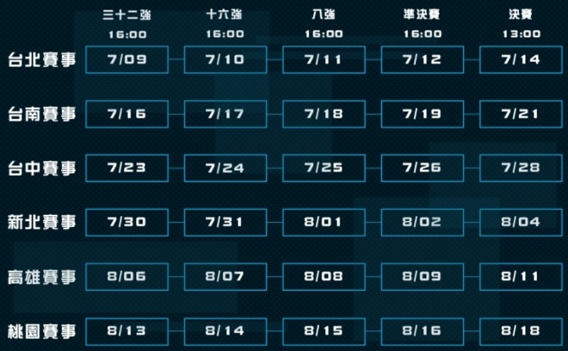 根據大會賽程,今年比賽將從台北率先於7月9日開打,每隔一週就換下個城市,依序為台南、台中、新北、高雄及桃園,因此桃園總決賽程將最後結束,將在8月18日落幕,第二階段的小組賽程將在8月20日展開為期四日的小組單循環賽;第三階段的淘汰賽則將8月25日及26日開打,屆時2018最強電競都市即將誕生。